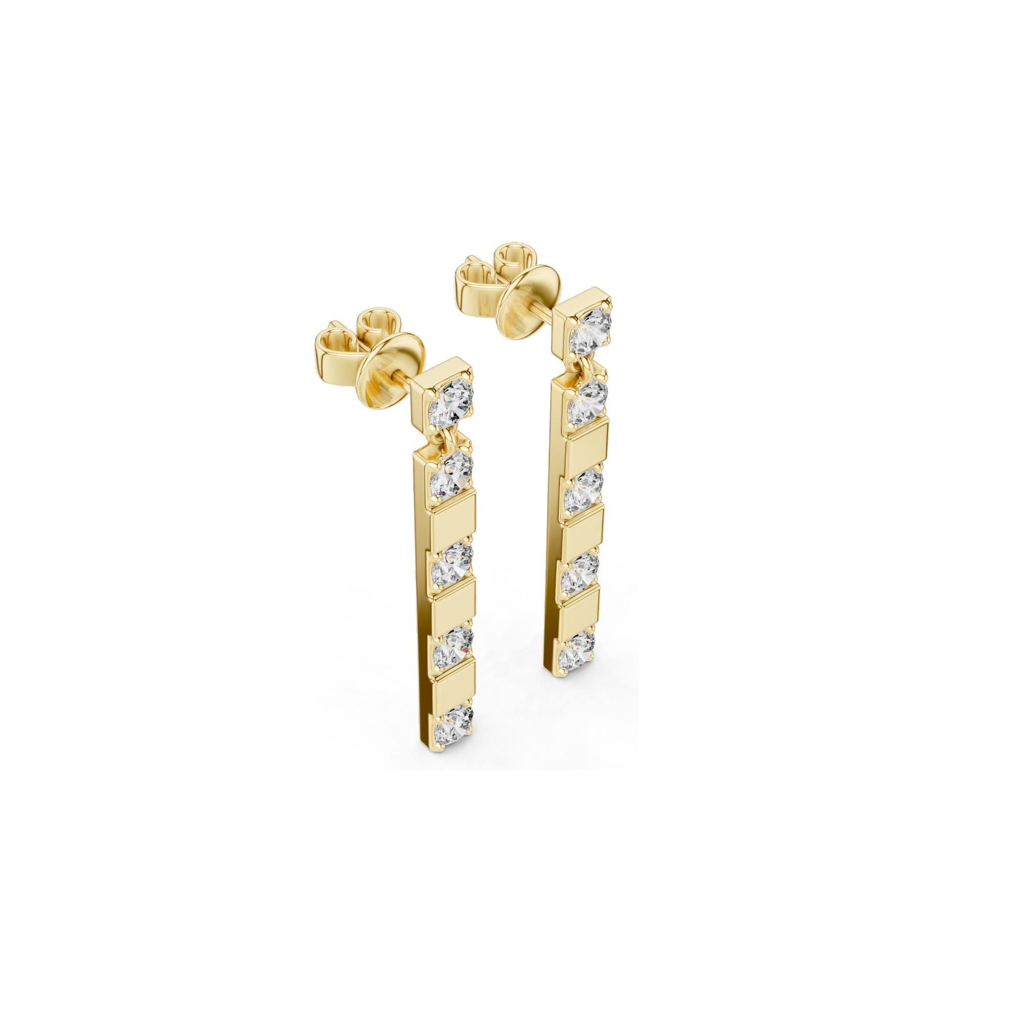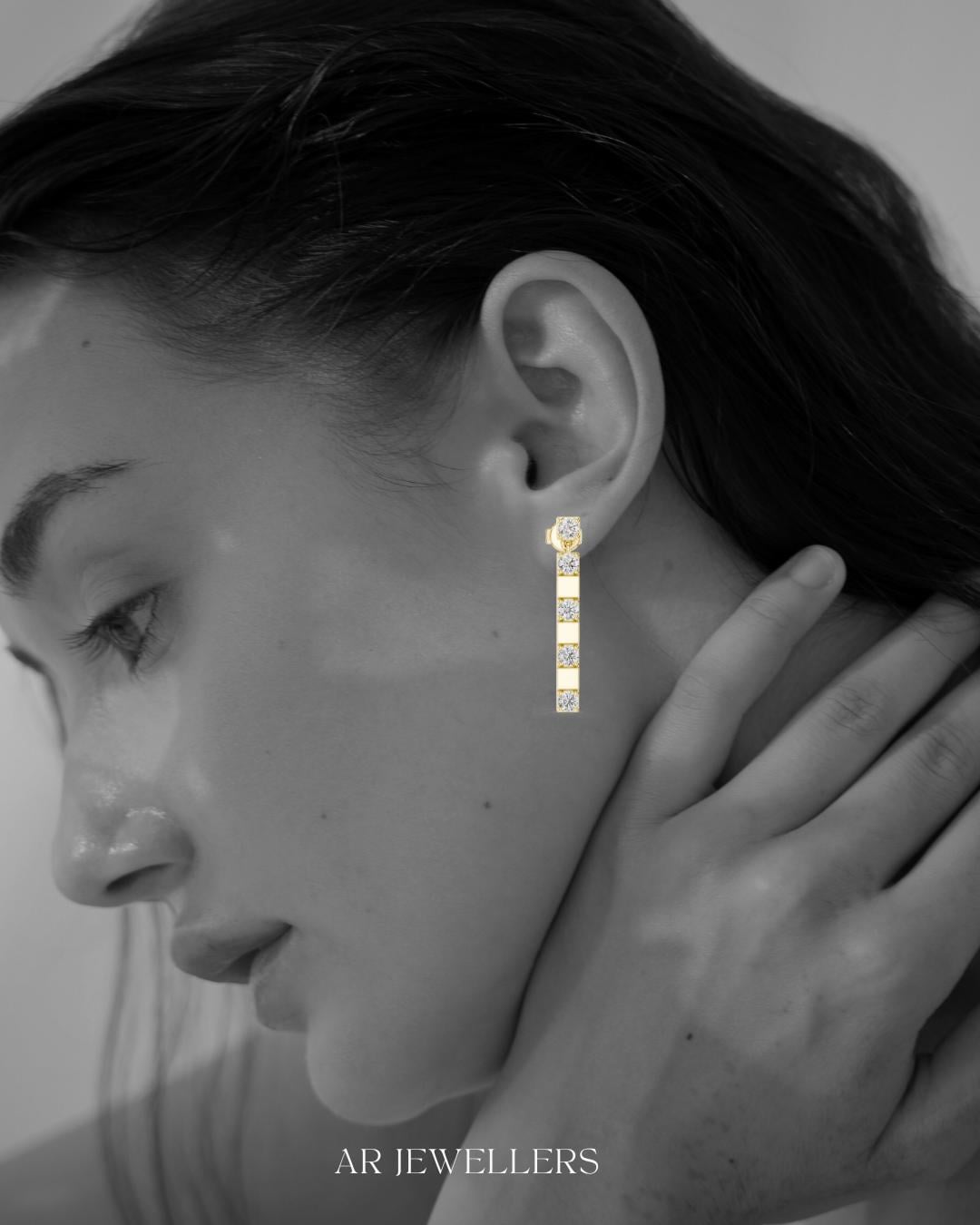 Experience the allure of minimalist elegance with these vertical bar earrings, designed to captivate with their diamond cut stones that sparkle with every movement. Crafted from radiant 18K gold, these modern bar earrings blend timeless sophistication with contemporary style, making them an ideal gift for mom or a luxurious treat for yourself. Each pair showcases the brilliance of moissanite, offering exceptional sparkle and durability.